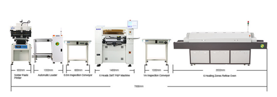 4. Three-section transmitting boards-automatic connection from left to right (The first section is waiting for mounting, the second section is responsible for mounting (When the PCB board finishes mounting and transmits to the third section, the first section also receives the demand to prepare a new boards simultaneously.), the third section transmits the board from p&p machine to reflow oven. Effectively save time of transmitting boards and improve efficiency.