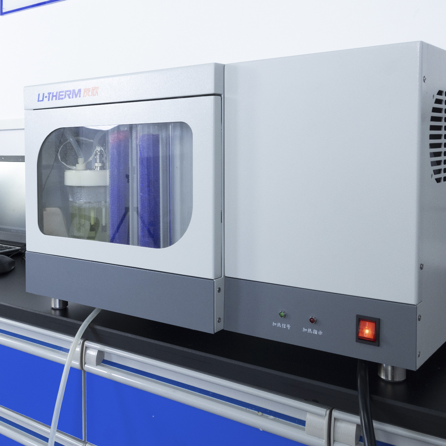 1. Adopting the integrated configuration, put the sample feeding device, electrical scale, vertical high temperature cracking furnace, electrolytic cell, stirrer, and gas purification system in a single container. Thus to make the instrument concise and graceful.
